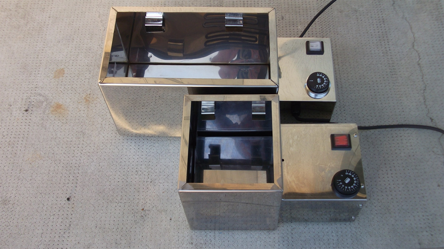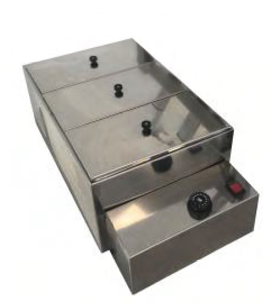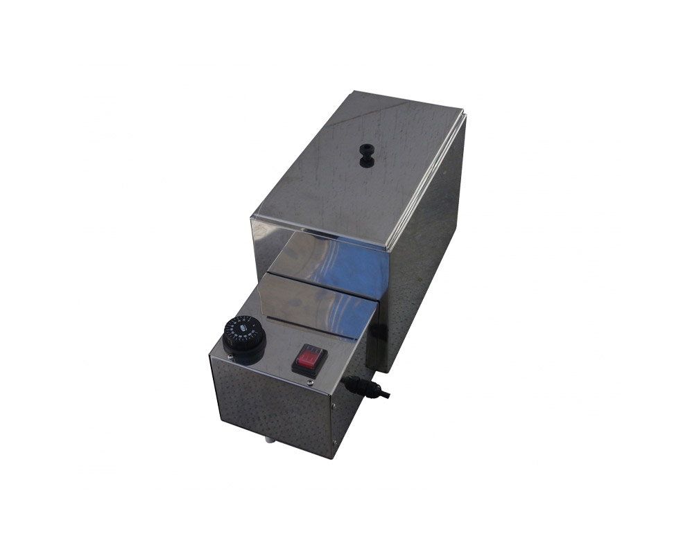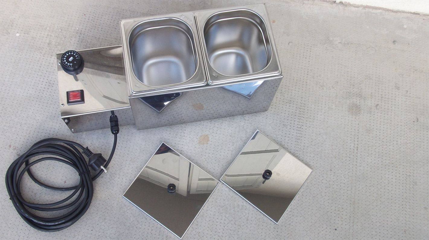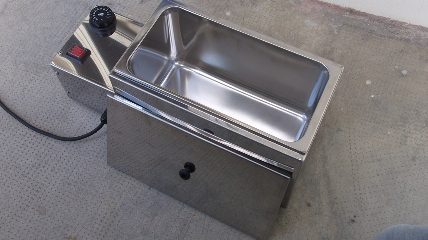 Depósito calentador de acero inox para derretir cera de sellado en un baño de agua con aceite diatérmico (no incluido). El calentador FORCIRE está equipado con un regulador de temperatura y un interruptor de arranque y está disponible en diferentes tamaños. Ideal para cubrir el cuello de la botella con cera.