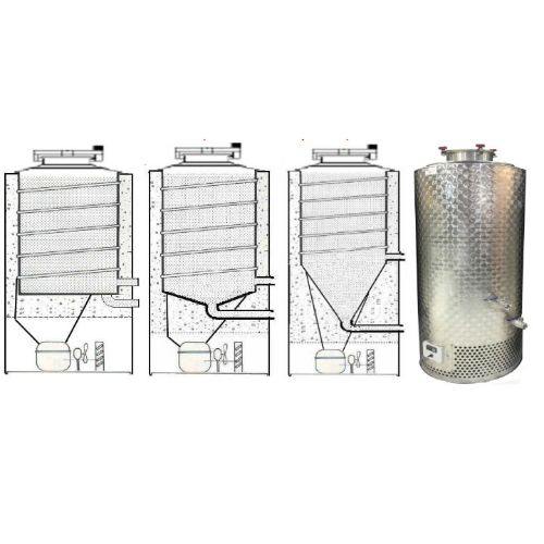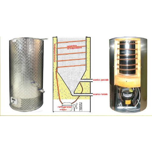 Cilindro interno de contención de líquido en acero inoxidable. Boca de hombre superior. Cavidad aislante en poliuretano expandido. Cilindro externo de acero inoxidable. Grupo frigorífico conforme a las normas CEE contenido en la base del depósito. Doble desagüe: total en el fondo y parcial a 5cm del fondo.
