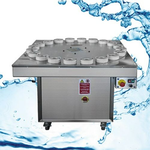 Enjuagadora-esterilizadora semiautomática TP/20D con bomba de recirculación con 20 bocas en mesa giratoria. Conjunto de filtro mediante un cartucho de 0.45 micras. La máquina ha sido diseñada para enjuagar el interior de las botellas nuevas con agua previamente filtrada sin mojar la parte externa, para eliminar el polvo residual y otros cuerpos extraños que puedan estar presentes en ellas.