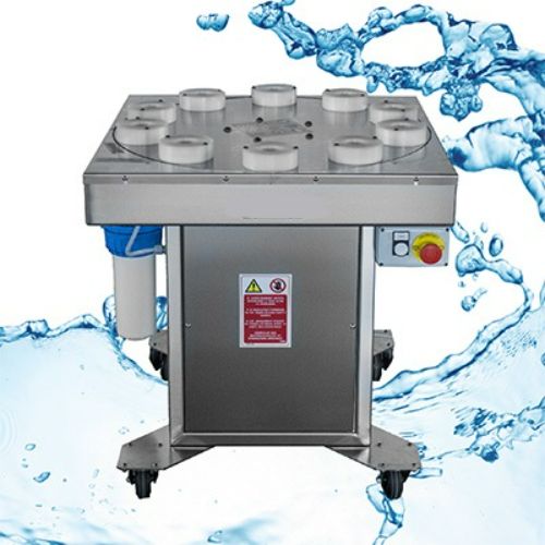 Enjuagadora semiautomática mod. TP10 con 10 bocas en mesa giratoria diseñada para enjuagar botellas nuevas antes de llenarlas, sin mojar la parte externa. Se utiliza agua prefiltrada mediante un conjunto de filtrado de agua equipado de un cartucho de 0.45 micras.