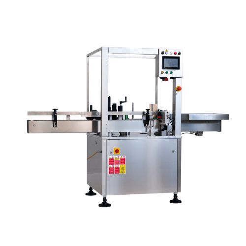 Etiquetadora para aplicación en autoadhesivo de etiqueta y contraetiqueta sobre botella redonda y collarín.