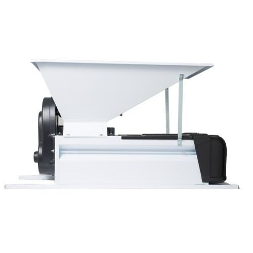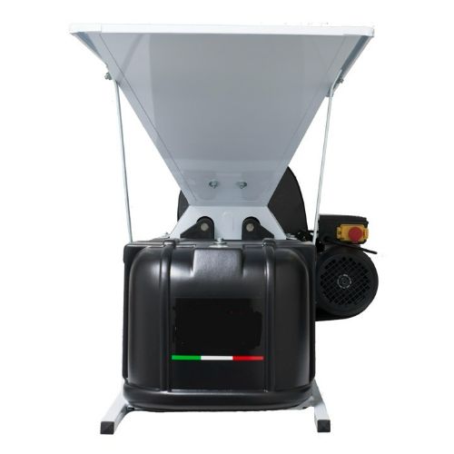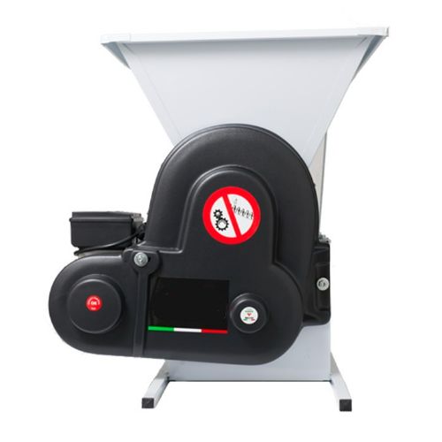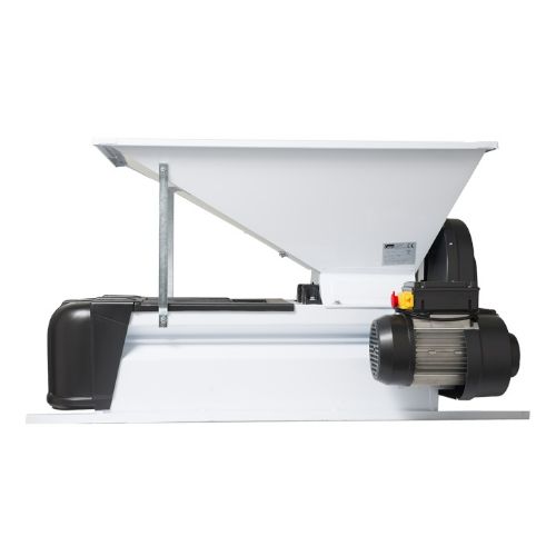 Estrujadora-despalilladora MOTORIZADA con tolva de entrada. Estrujado de la uva mediante rodillos de nylon, despalillado con patas helicoidales. Jaula de despalillado no giratoria pero desmontable para su limpieza.