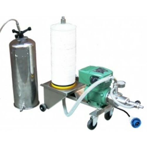 Filtro construido en acero inox de campana cerrada para la filtración de aceite de oliva mediante placas redondas. La campana preserva el aceite de la oxidación.
