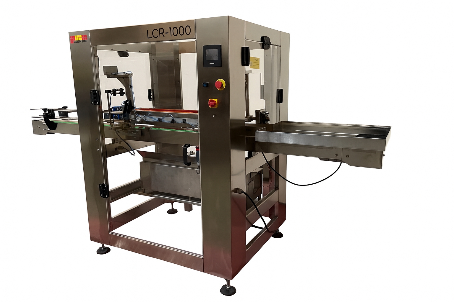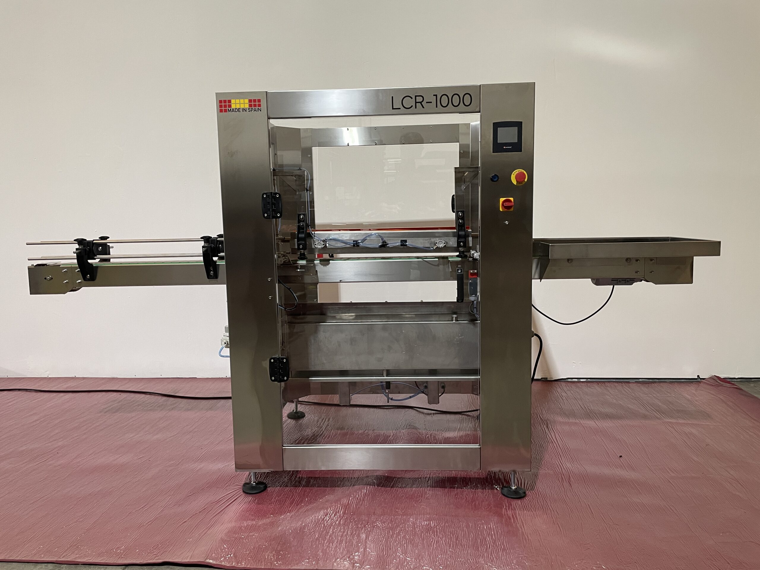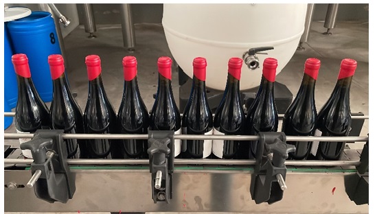 Máquina de lacrado automática para aplicar lacre en botellas. Esta lacradora se puede acoplar a una línea de embotellado. Posibilidad de realizar distintos tipos de lacrado: lacrado a 45º o a la angulación que deseemos, lacrado de solo punta de gollete, etc…).