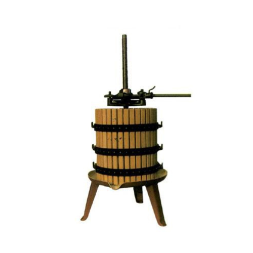 Prensa para vino con movimiento manual a palanca. Base en hierro pintado con robustos refuerzos. Tornillos en acero de alta resistencia. Listones de la jaula en madera de haya fijados con pasadores. Dotada con 6 tacos de madera y dos medias lunas de madera.