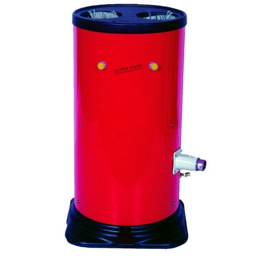 Lavadora manual de dos puestos de botellas para el lavado interior de las botellas con agua por medio de un cepillo central giratorio y el lavado exterior por medio de un cepillo de nylon fijo.